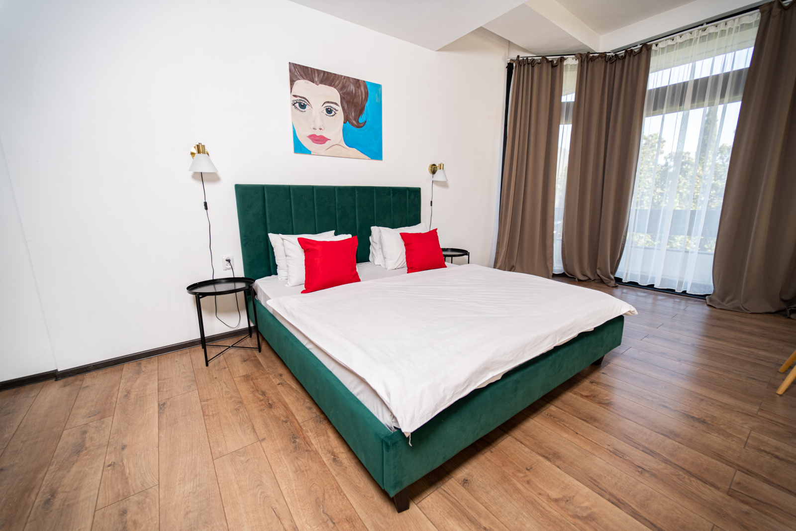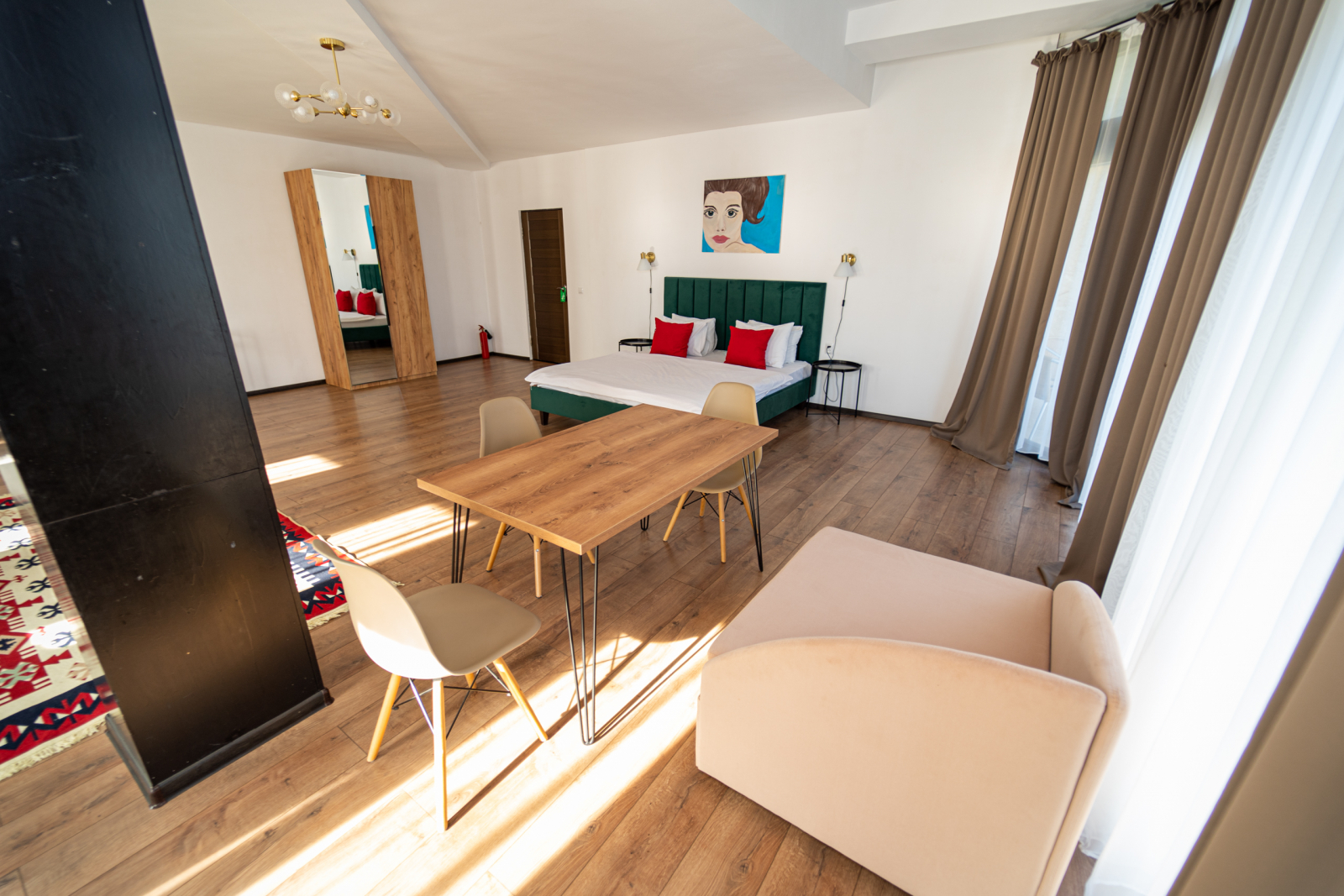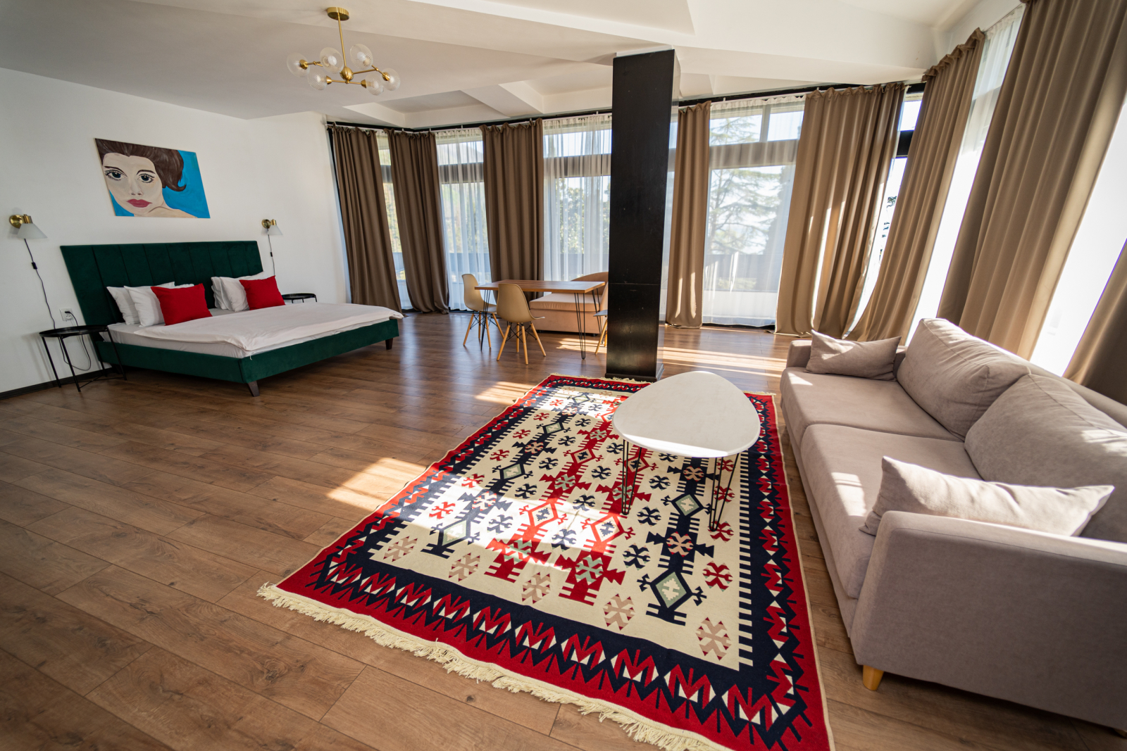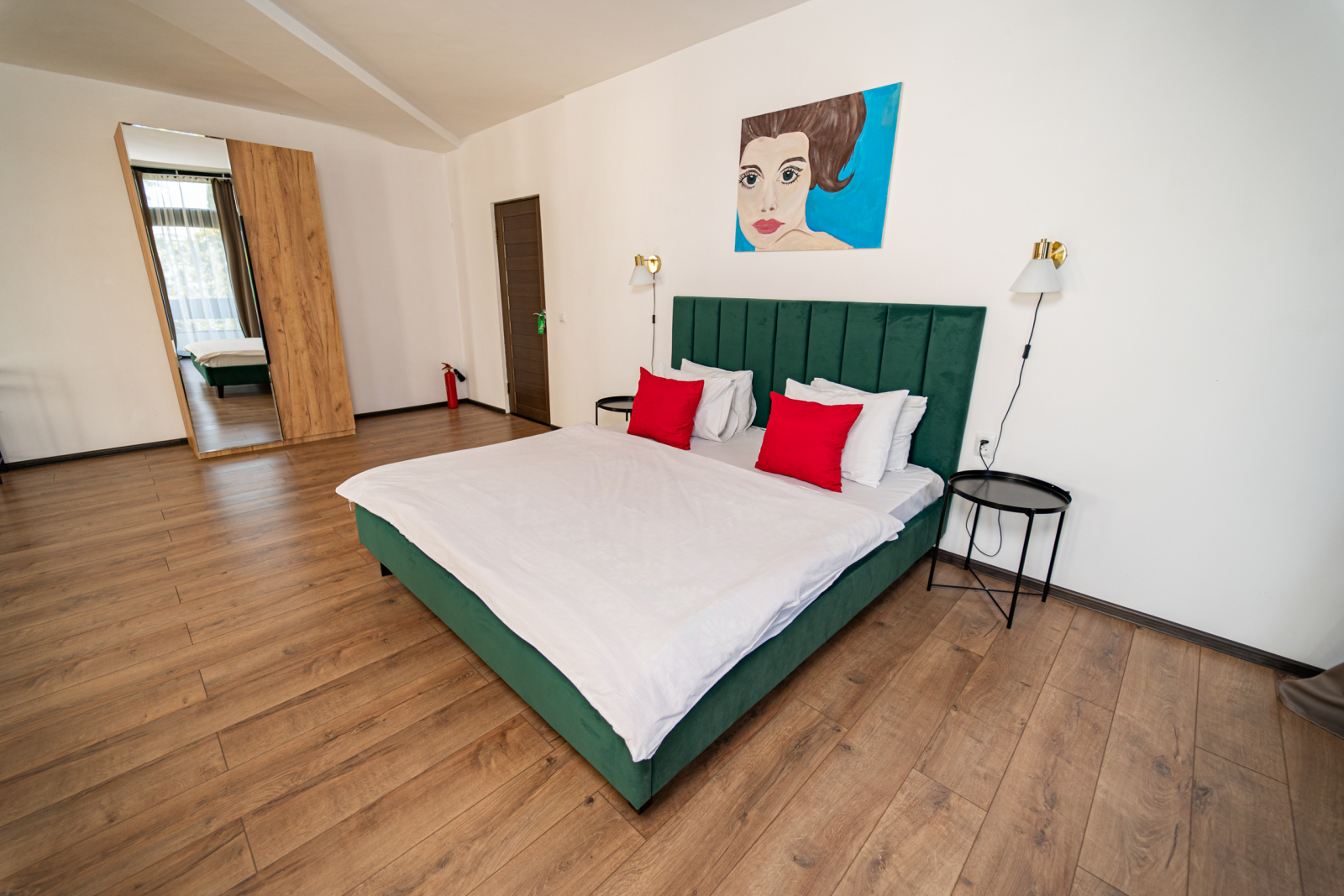 Площадь номера - 65 кв.м. 2 осн. места. 1 доп. место. Балкон. Мебель: вешалка, диван раскладной, зеркало, кресло, кровать двуспальная, прикроватные тумбочки, стол, столик журнальный, стол обеденный, стулья, шкаф. Оборудование: кондиционер, телевизор, холодильник, чайный набор посуды, электрочайник. Санузел: с ванной/душем, фен. Сервис: Wi-Fi бесплатно, смена полотенец, смена постельного белья, уборка номера.