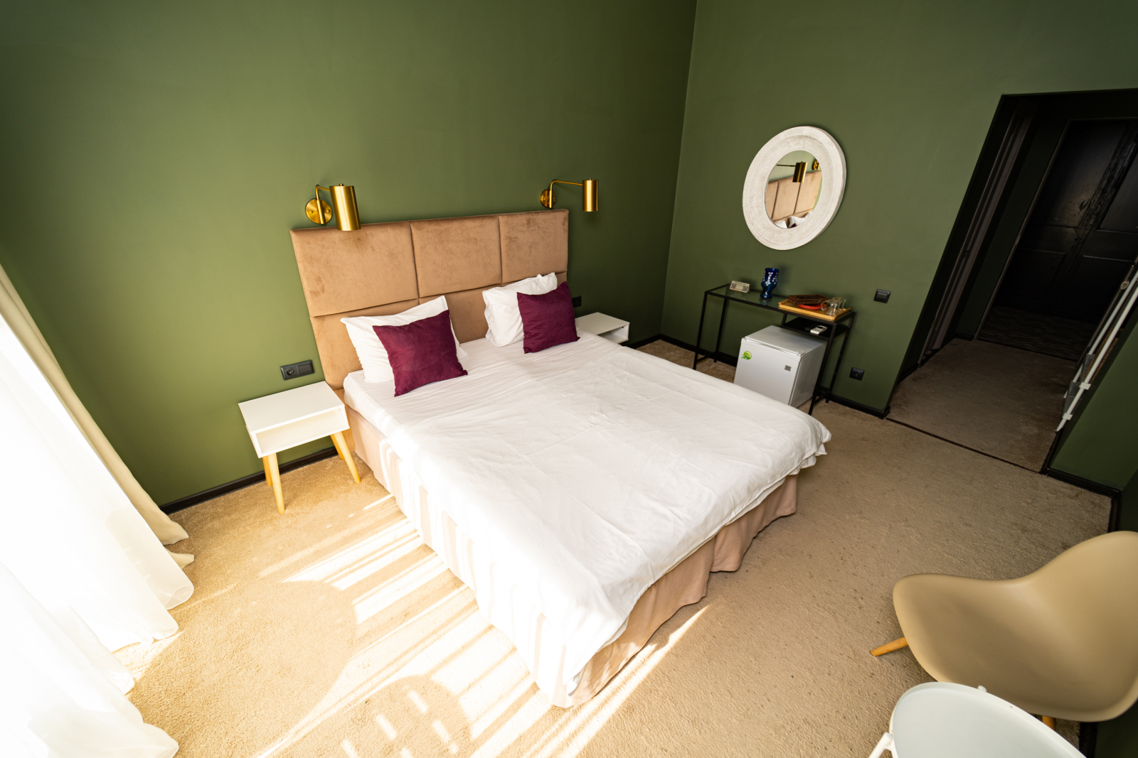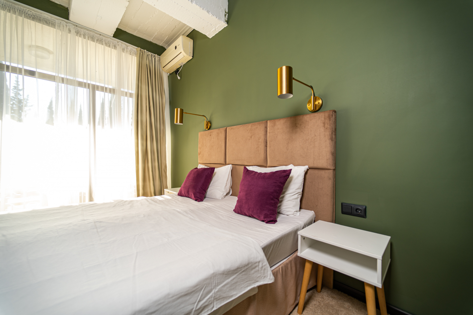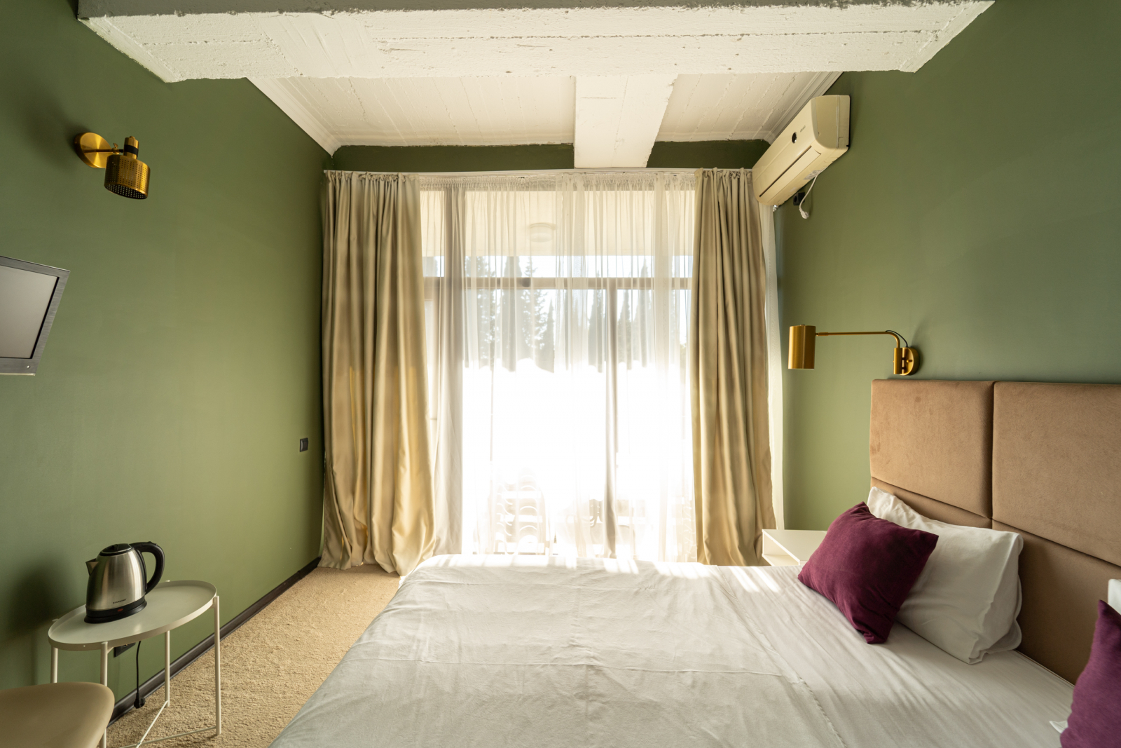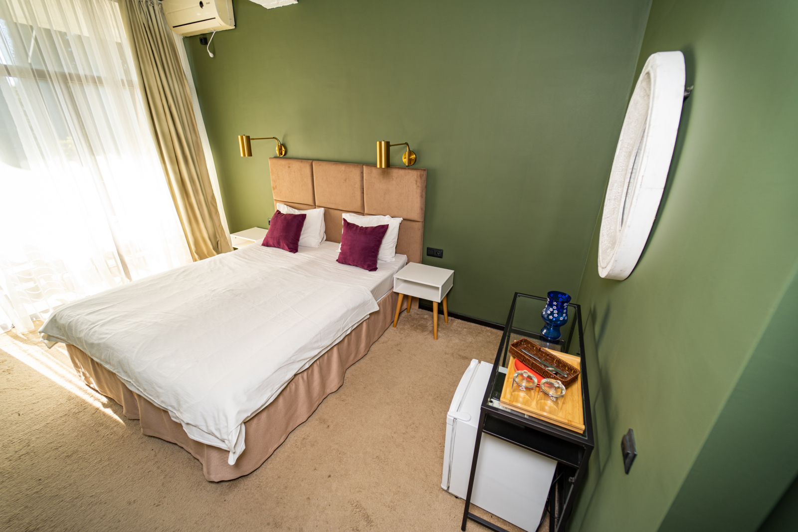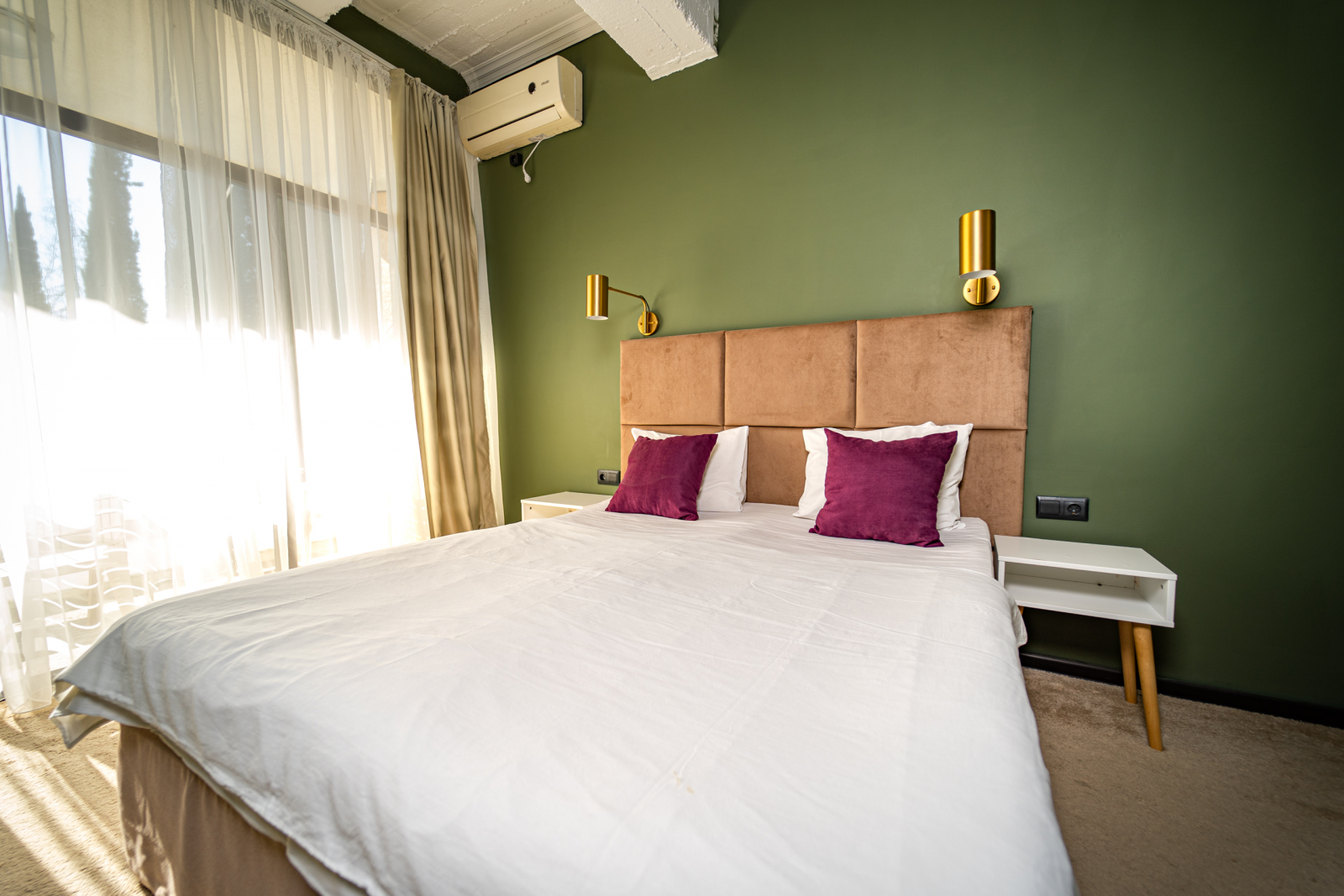 Площадь номера - 22 кв.м. 2 осн. места. 1 доп. место. Балкон. Мебель: вешалка, зеркало, кровати односпальные /одна двуспальная кровать, прикроватные тумбочки, стол, столик журнальный, стул, шкаф. Оборудование: кондиционер, телевизор, холодильник, чайный набор посуды, электрочайник. Санузел: с душем, фен. Сервис: Wi-Fi бесплатно, смена полотенец, смена постельного белья, уборка номера.